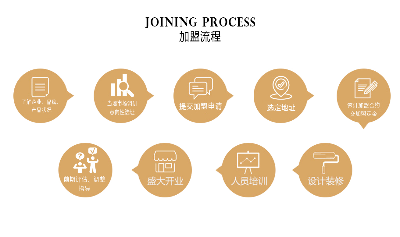 了解企業(yè)、品牌、產(chǎn)品狀況 --> 當?shù)厥袌稣{(diào)研,意向性選址 --> 提交加盟申請 --> 選定店址 --> 簽訂加盟合約,交加盟定金 --> 陳列展示設(shè)計、商品組合、店面裝潢及實施 --> 專業(yè)培訓(xùn) --> 人員、商品、展示列位、新店開張 --> 前期評估、指導(dǎo)、調(diào)整